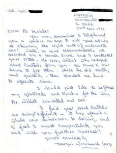 In 1976 he shook many a foundation by training 58 wheelchair users to install hand controls when competing abroad, they also actively tested all his innovations and put Alfred wise of what was right and wrong. Some of the fitters branched out and set up their own business, but still treated Alfred as their mentor and continued to copy his designs. In the early years, the hub of all activity was a converted farm, slaughter house, butcher shop and stables as the assessment centre, in the sleepy Yorkshire Wolds village of Langtoft.